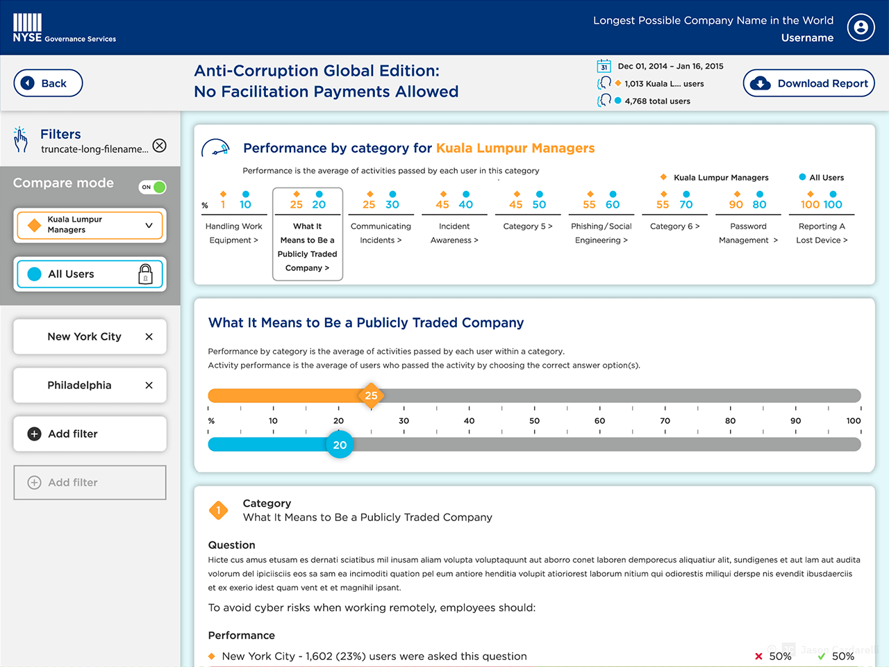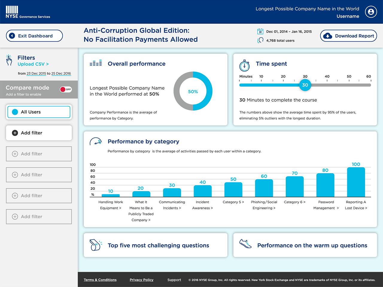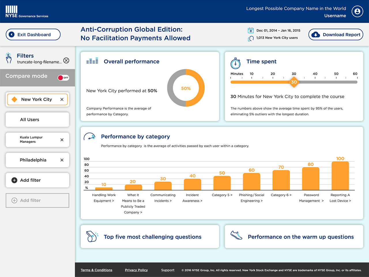 As a leader in interactive compliance training, The New York Stock Exchange creates software that is utilized by more than 600 clients listed on the NYSE. For clients, being able to measure the compliance of their workforce is critical. This analytics portal allows clients to view and compare the training results of their employees, as well as easily identify areas for improvement.
