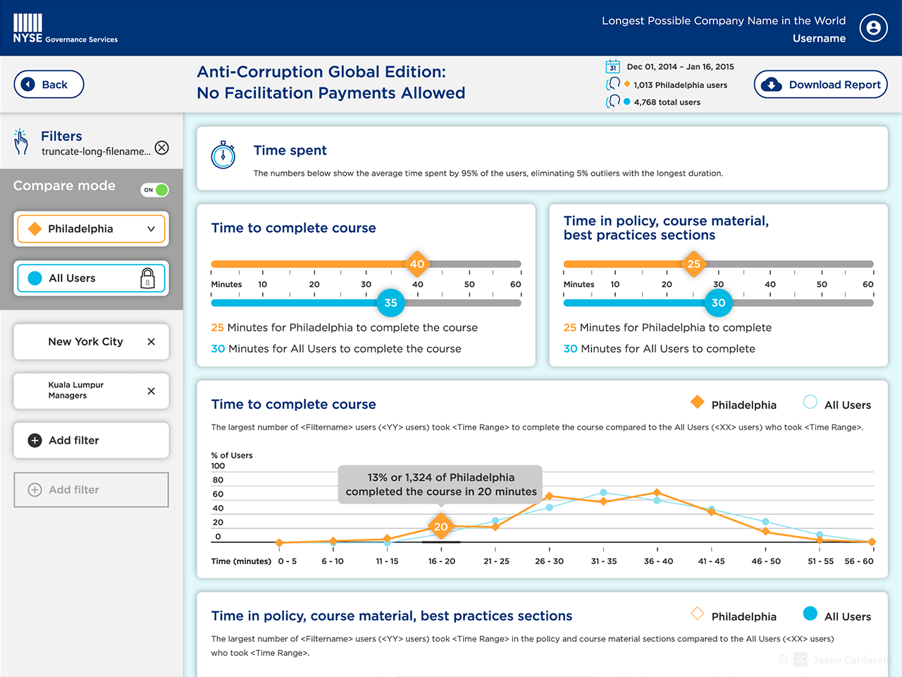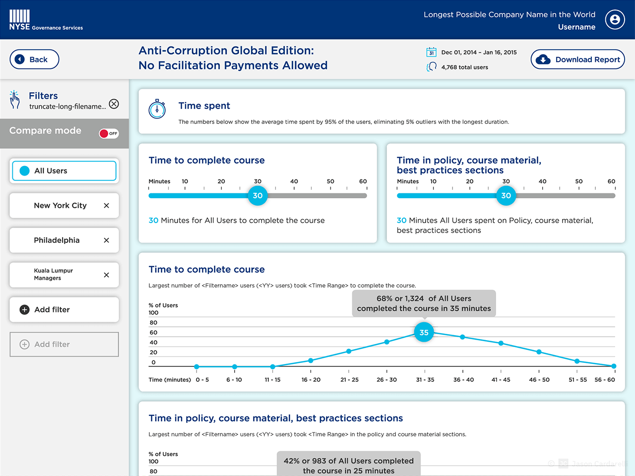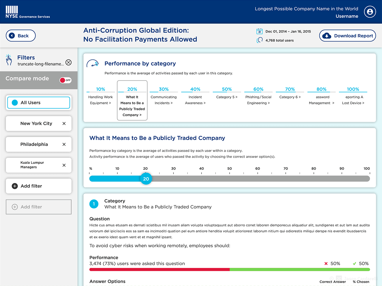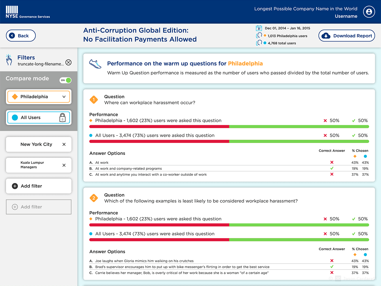 As a leader in interactive compliance training, The New York Stock Exchange creates software that is utilized by more than 600 clients listed on the NYSE. For clients, being able to measure the compliance of their workforce is critical. This analytics portal allows clients to view and compare the training results of their employees, as well as easily identify areas for improvement.